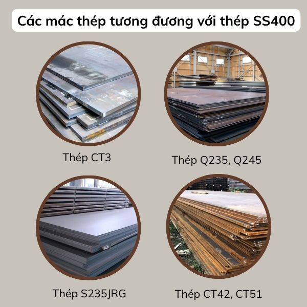 | Loại thép | Tiêu chuẩn | Mác thép tương đương | Giới hạn chảy (N/mm²) | Ứng dụng |